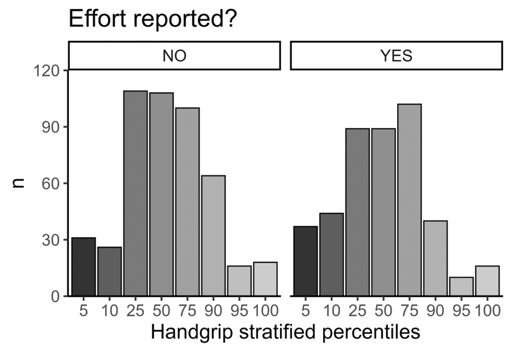 La domanda successiva che ci siamo posti, è: “le persone con un handgrip inferiore riportano più spesso di svolgere azioni che richiedono forza muscolare?“.