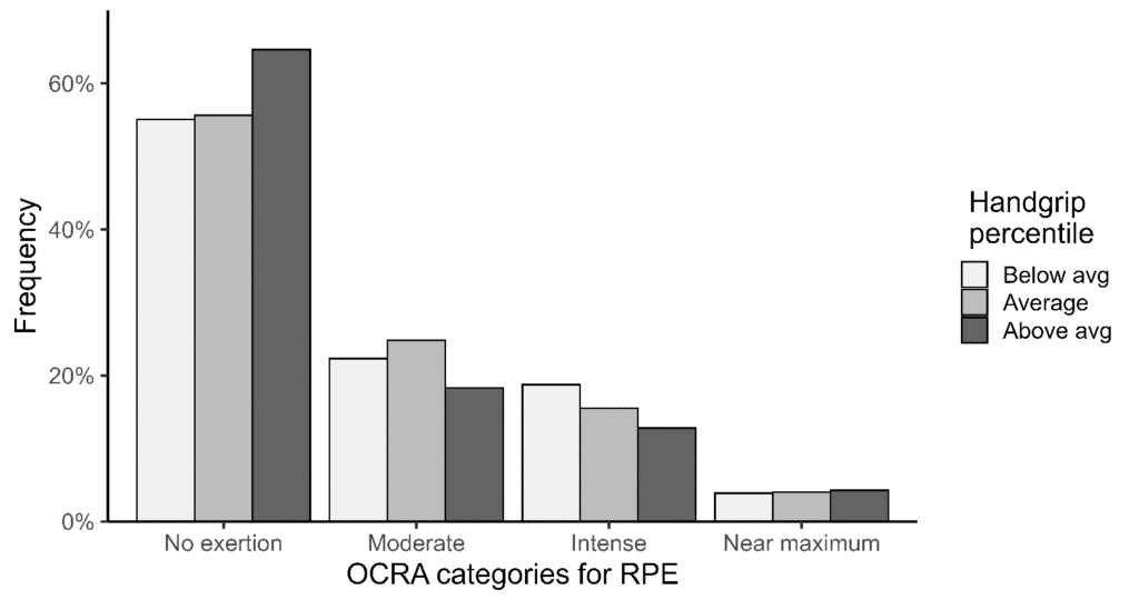 In chi ha riportato uso di forza nelle proprie mansioni, troviamo una percentuale maggiore di lavoratori sotto al 25° percentile, e ritroviamo lo stesso trend se invertiamo il punto di vista, e guardiamo come si dividono le persone con un handgrip inferiore (< 25° percentile), superiore (> 75°), o nella media (tra 25° e 75°) tra le varie categorie di sforzo percepito utilizzate dalla checklist OCRA: