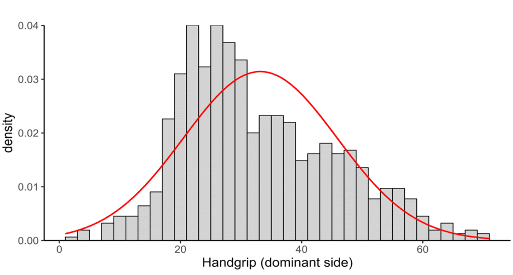 Nel corso degli ultimi 4 anni, quindi, abbiamo aggiunto questa valutazione alla normale procedura di valutazione del rischio per movimenti ripetitivi, raggiungendo un totale di 41 aziende in diverse regioni d’Italia, valutando in totale 903 persone (di cui 4 sono state escluse per aver ottenuto un handgrip inferiore a 5 kg, risultato ritenuto non verosimile). Dai risultati emerge come queste persone (la cui distribuzione è rappresentata dalle colonnine grigie, in figura) mostrino livelli di forza generalmente inferiori alla popolazione generale (la curva rossa)
